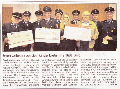(es) „Gott zur Ehr, dem Nächsten zur Wehr“, das Motto der Feuerwehren praktizierten am Sonntag die Spritzenmänner von Großenschwand auf ungewöhnliche Weise: Sie überreichten Schirmherrin Elisabeth Wittmann für die Aktion „Lichtblicke“ einen Scheck über 500 Euro. „Beim Jubelfest im Sommer gab es keine Erinnerungsgeschenke. Wir beschlossen, das Geld zu spenden“, sagte Vorsitzender Karl Kraus. Aufmerksam lauschten mit ihm Kommandant Hans Götz und Festbraut Julia Schönberger, als Wittmann erzählte, wofür die Spenden verwendet werden. Häufig sei umfassende Hilfe notwendig: „Wir zeigen auf, welche anderen Möglichkeiten es noch gibt.“ Bei „Lichtblicke“ arbeiteten alle ehrenamtlich, daher könne das Geld zu 100 Prozent weitergegeben werden.
